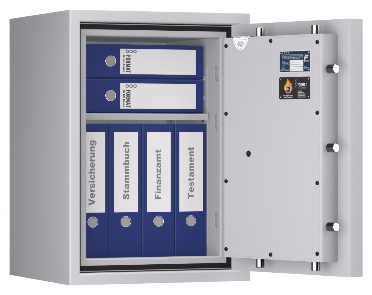 Feuerschutz: 30 Minuten Brandschutz inkl. umlaufender Spezialdichtung zum Brandschutz und Schutz vor Löschwasser oder Löschschaum in der Tür. Getestet im FORMAT-Brandschutzlabor.