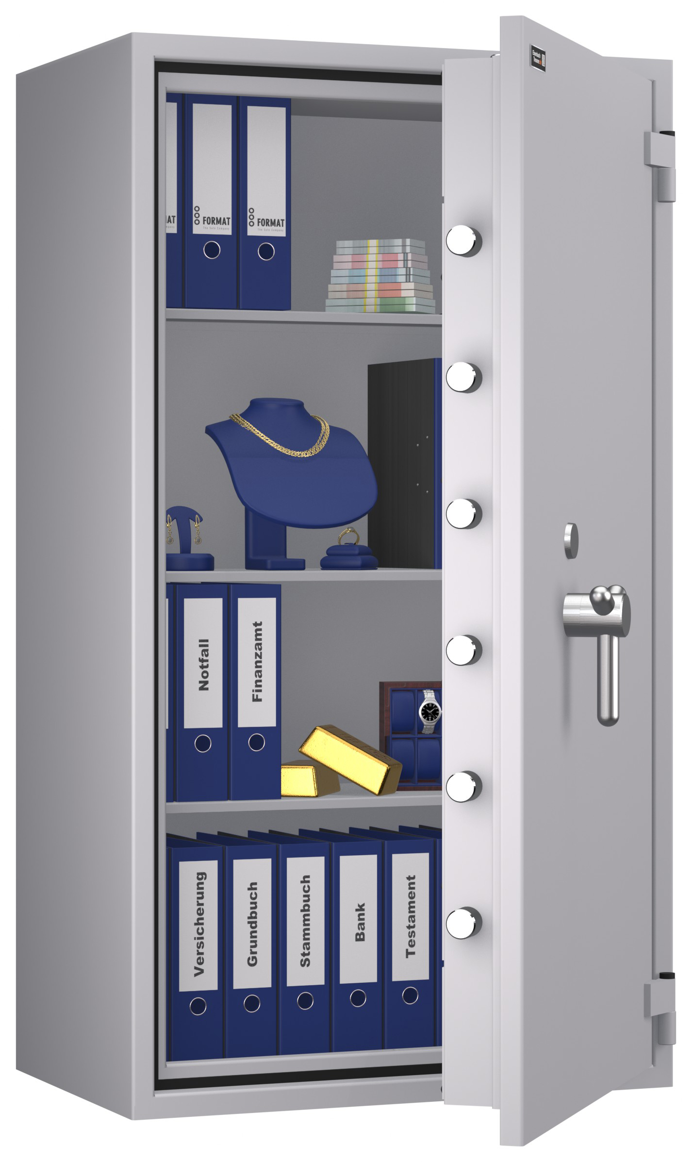 - Höchst widerstandsfähige Türfront und Korpus gegen Angriffe mit mechanischen und thermischen Einbruchwerkzeugen.